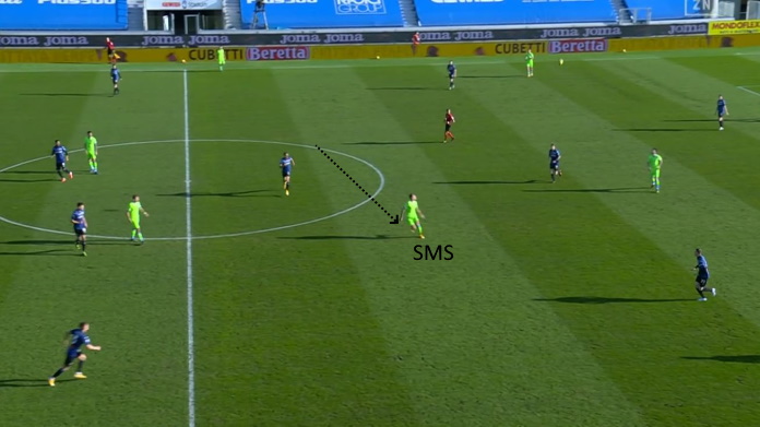 Lazzari si invola alle spalle di Maehle. Tutto nasce da Reina, che serve molto bene Correa che effettua un prezioso movimento a venire incontro (e che oltretutto porta fuori posizione il difensore).
